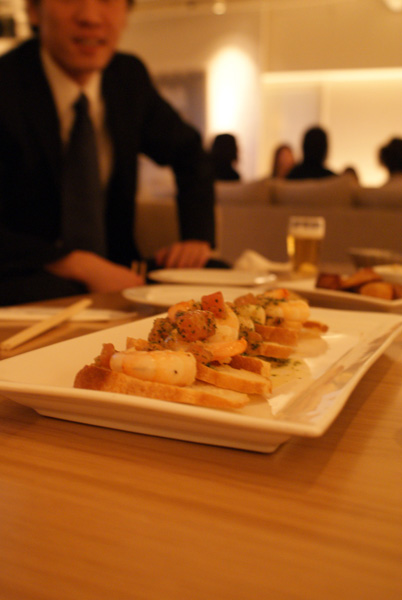 料理は、割と豪華な感じで、いろいろと登場してました!バケットの上に海老とかパテとか・・・そういうのが乗ってるやつ。おされな前菜。