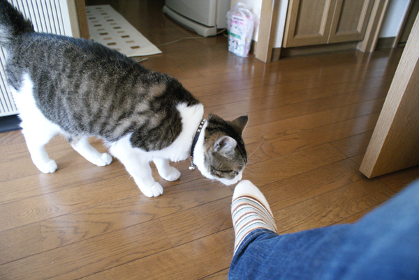 うちのねこちゃん。「みう」ちゃんが足のにおいを嗅いで来ました。